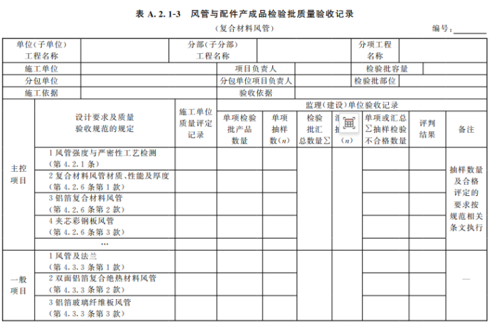 A.2.1风管与配件产成品检验批质量验收记录可按表A.2.1-1~A.2.1-3的格式进行填写。