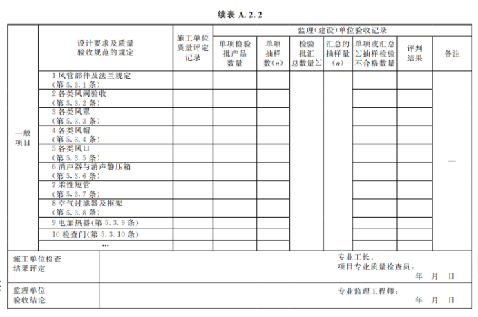 A.1.1通风与空调分部工程施工质量检验批验收记录,应在施工企业质量自检的基础上,由监理工程师(或建设单位项目专业技术负责人)组织会同项目施工员及质量员等对该批次工程质量的验收过程与结果进行填写。验收批验收的范围、内容划分,应由工程项目的专业质量员确定,并应按本规范第A.2.1条~第A.2.8条的要求进行填写与申报,验收通过后,应有监理工程师的签证。